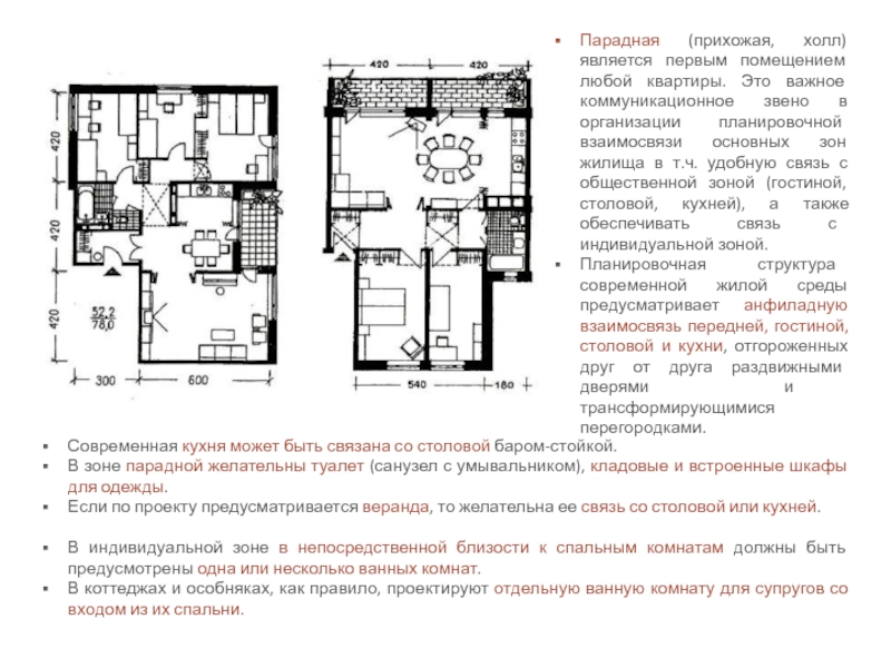 В зоне парадной желательны туалет (санузел с умывальником), кладовые и встроенные шкафы для одежды.