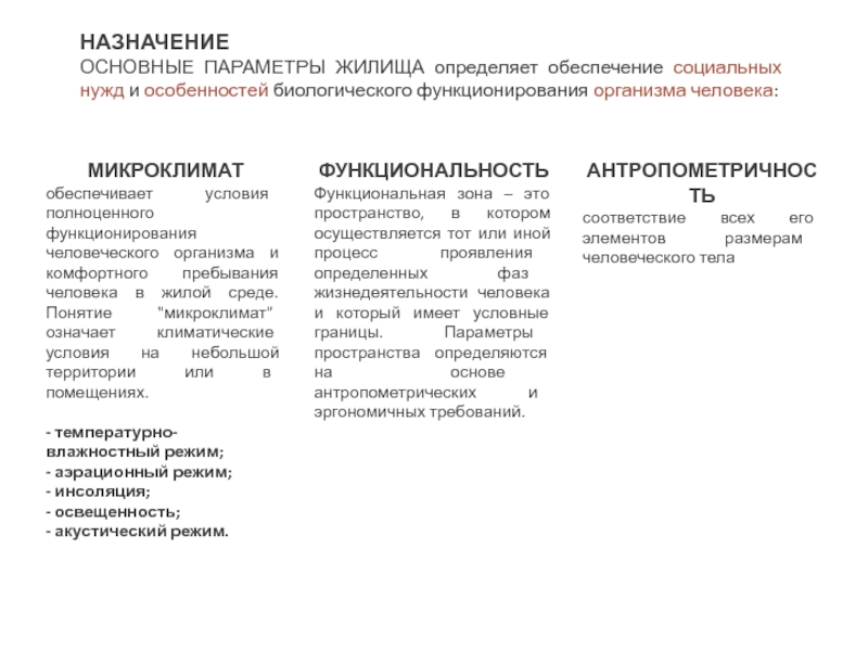 ОСНОВНЫЕ ПАРАМЕТРЫ ЖИЛИЩА определяет обеспечение социальных нужд и особенностей биологического функционирования организма человека: