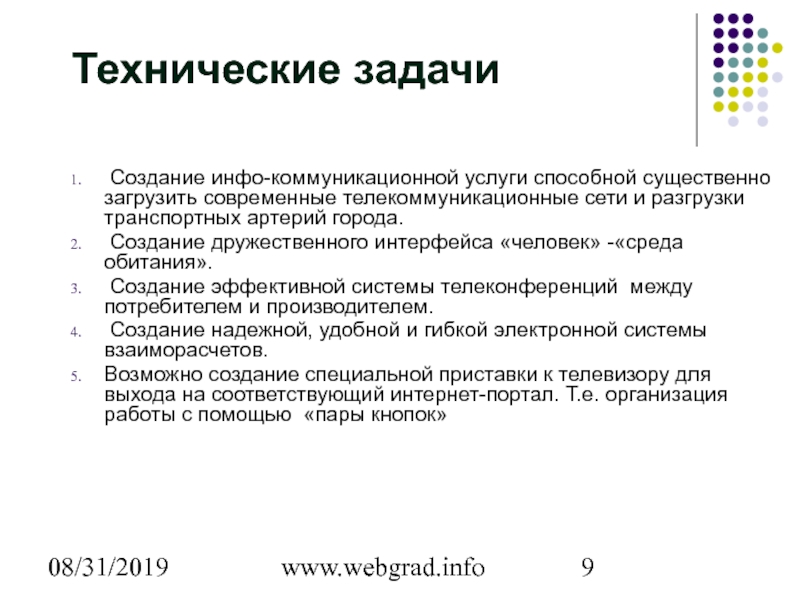 Организация большегрузных транспортных компаний для централизованной развозки товаров заказанных в Вебгороде, при этом нагрузка на транспортные магистрали города N-ска будет уменьшена, за счет увеличения трафика по сетям связи. Телеконференции тоже работают на это.