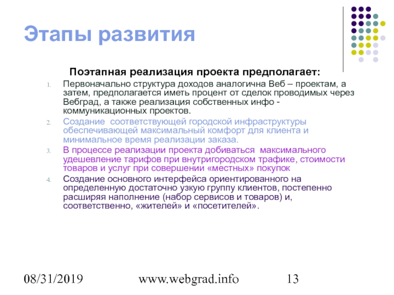 Для начала данный проект необходимо подать в качестве демо – версии некоторой ON-line игры. По ней можно оценить масштабы посещения Вебгорода. Разумеется надо провести маркетинговое исследование.