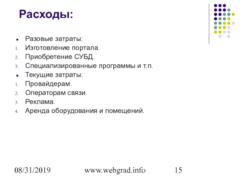 Первоначально структура доходов аналогична Веб – проектам, а затем, предполагается иметь процент от сделок проводимых через Вебград, а также реализация собственных инфо - коммуникационных проектов.