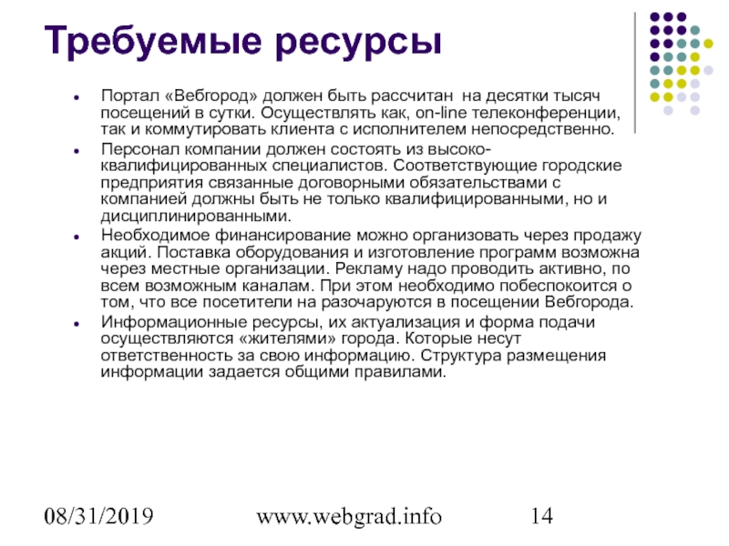 Необходимое финансирование можно организовать через продажу акций. Поставка оборудования и изготовление программ возможна через местные организации. Рекламу надо проводить активно, по всем возможным каналам. При этом необходимо побеспокоится о том, что все посетители на разочаруются в посещении Вебгорода.
