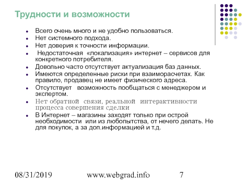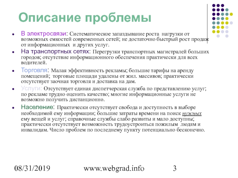 Услуги: Отсутствует единая диспетчерская служба по представлению услуг; по рекламе трудно оценить качество; многие информационные услуги не возможно получить дистанционно.