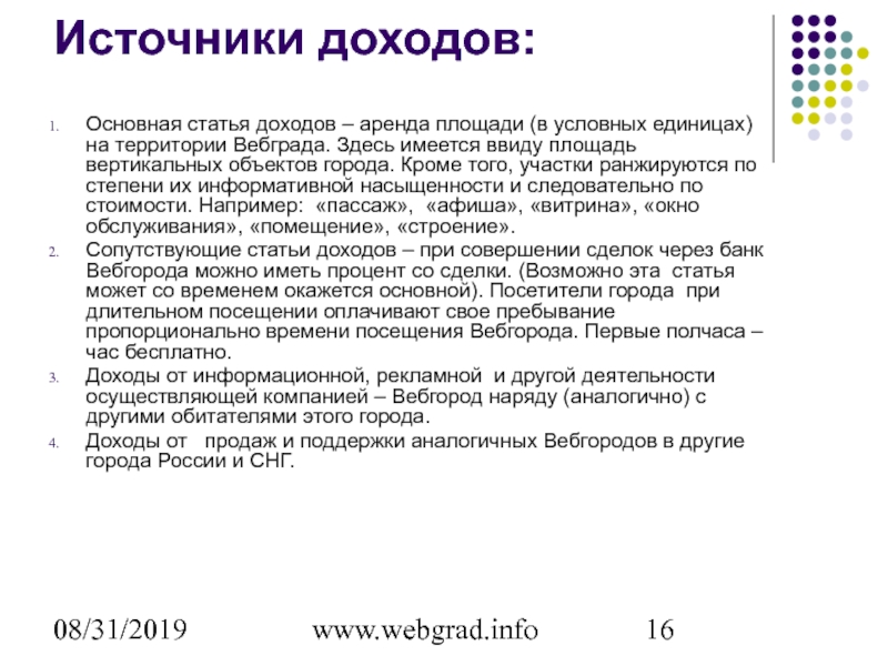 Сопутствующие статьи доходов – при совершении сделок через банк Вебгорода можно иметь процент со сделки. (Возможно эта статья может со временем окажется основной). Посетители города при длительном посещении оплачивают свое пребывание пропорционально времени посещения Вебгорода. Первые полчаса – час бесплатно.