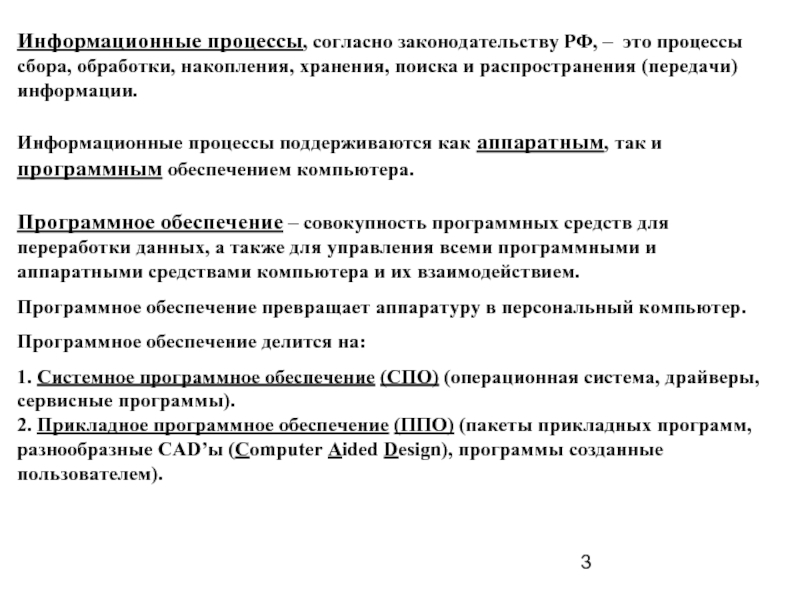 Слайд 3Информационные процессы, согласно законодательству РФ, – это процессы сбора, обработки, накопления,