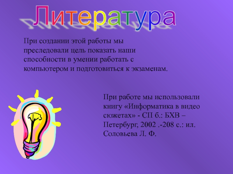 При работе мы использовали книгу «Информатика в видео сюжетах» - СП б.: БХВ – Петербург, 2002 .-208 с.: ил. Соловьева Л. Ф.
