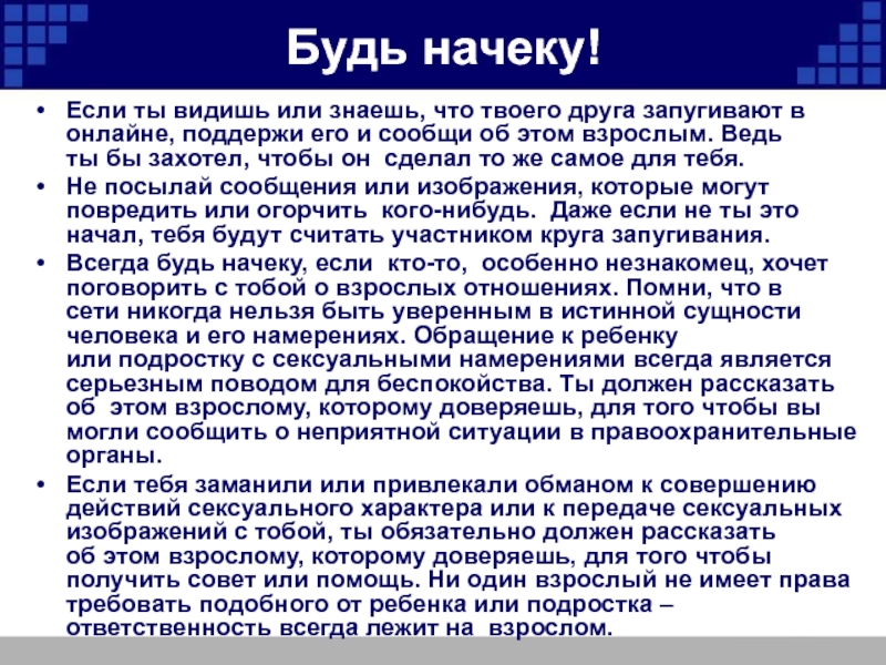 Если тебе приходят письма с неприятным или оскорбляющим тебя содержанием, если кто-то ведет себя в твоем отношении неподобающим образом, сообщи об этом взрослым.