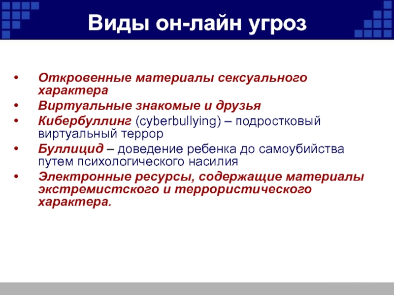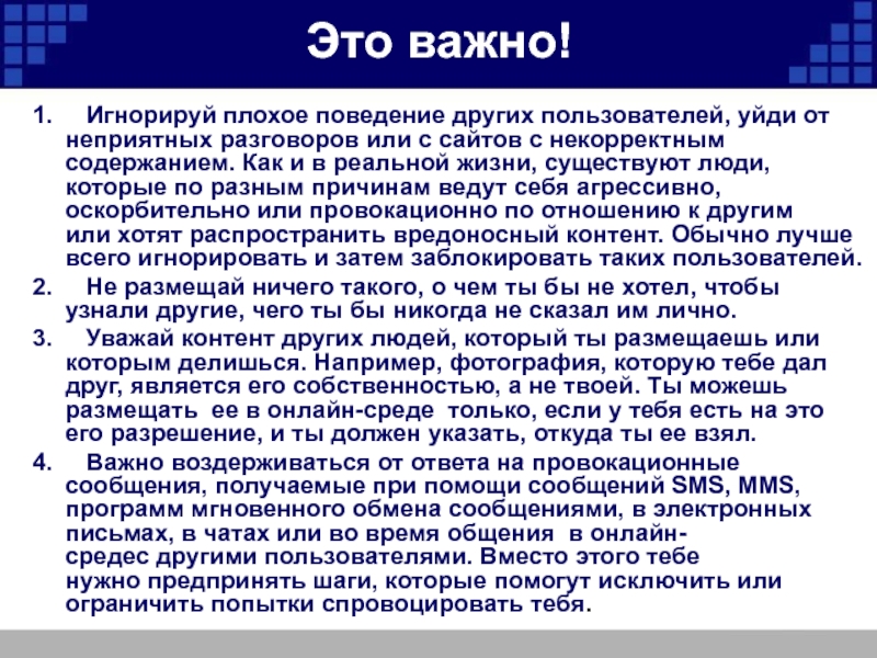 их. Ты никогда не должен терпеть преследования или запугивания со стороны других людей. Законы реальной жизни также действуют и в онлайн-среде.