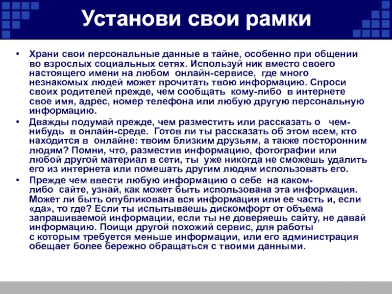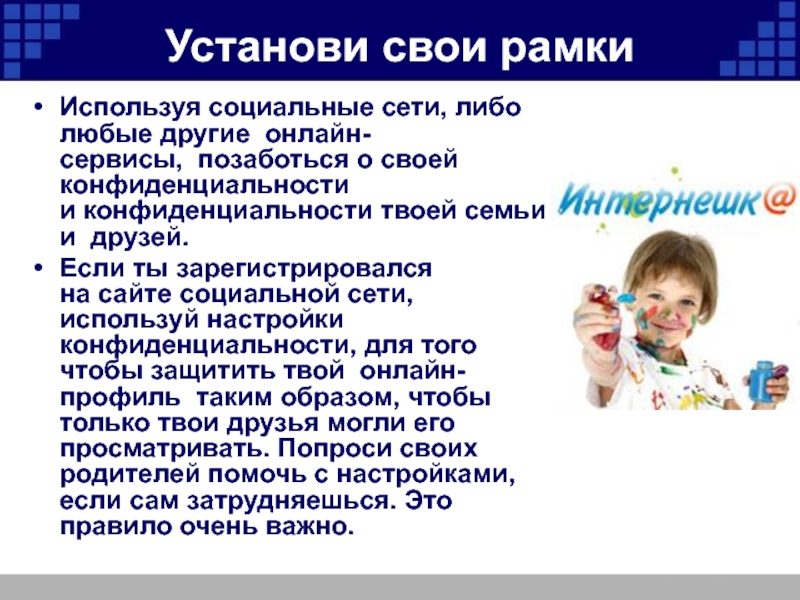 социальных сетях. Используй ник вместо своего настоящего имени на любом онлайн-сервисе, где много незнакомых людей может прочитать твою информацию. Спроси своих родителей прежде, чем сообщать кому-либо в интернете свое имя, адрес, номер телефона или любую другую персональную информацию.