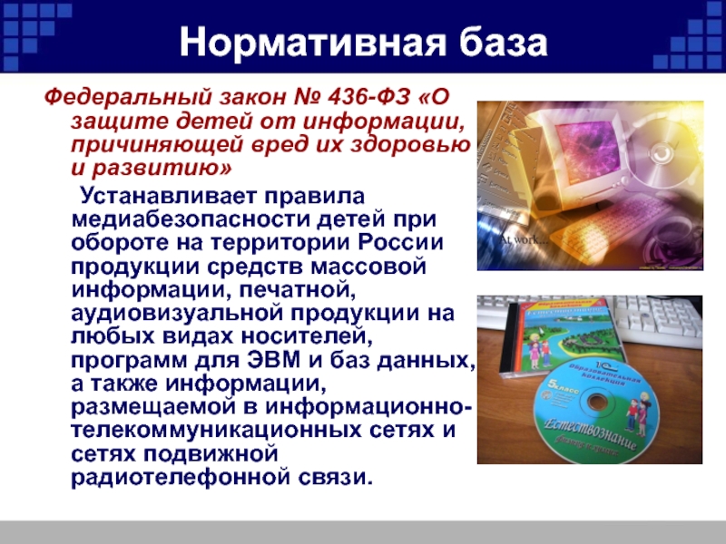 Устанавливает правила медиабезопасности детей при обороте на территории России продукции средств массовой информации, печатной, аудиовизуальной продукции на любых видах носителей, программ для ЭВМ и баз данных, а также информации, размещаемой в информационно-телекоммуникационных сетях и сетях подвижной радиотелефонной связи.