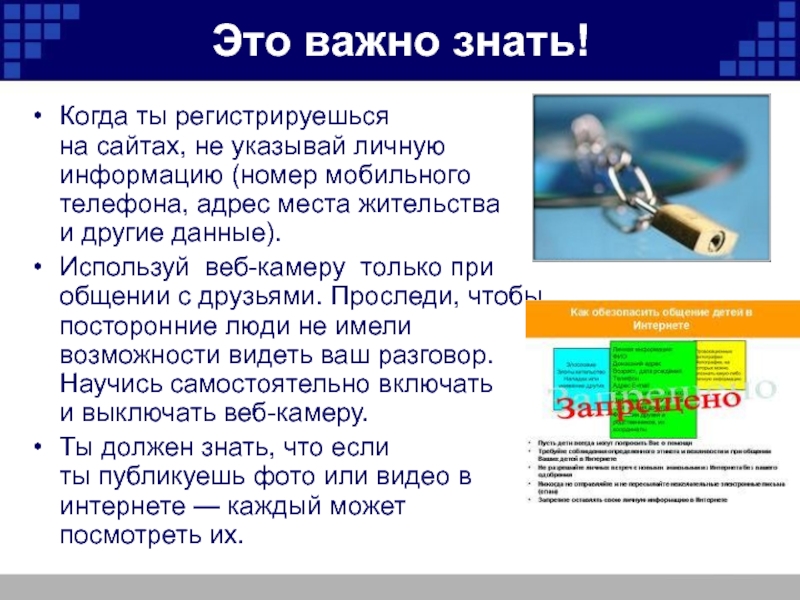 Используй веб-камеру только при общении с друзьями. Проследи, чтобы посторонние люди не имели возможности видеть ваш разговор. Научись самостоятельно включать и выключать веб-камеру.