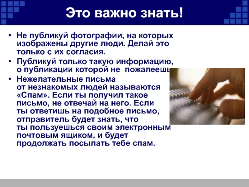 Нежелательные письма от незнакомых людей называются «Спам». Если ты получил такое письмо, не отвечай на него. Если ты ответишь на подобное письмо, отправитель будет знать, что ты пользуешься своим электронным почтовым ящиком, и будет продолжать посылать тебе спам.