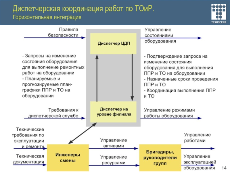 Информационная поддержка принятия управленческих решений с целью повышения эффективности диспетчерского управления во взаимодействии с обслуживанием и ремонтами технологического оборудования, зданий и сооружений.