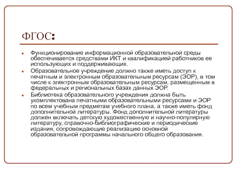 Образовательное учреждение должно также иметь доступ к печатным и электронным образовательным ресурсам (ЭОР), в том числе к электронным образовательным ресурсам, размещенным в федеральных и региональных базах данных ЭОР.