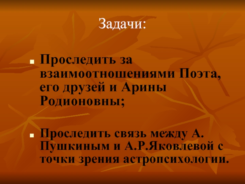 Проследить за взаимоотношениями Поэта, его друзей и Арины Родионовны;