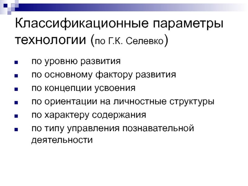 Слайд 3Классификационные параметры технологии (по Г.К. Селевко)