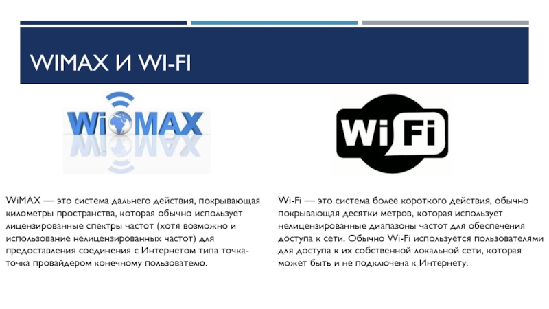 Wi-Fi — это система более короткого действия, обычно покрывающая десятки метров, которая использует нелицензированные диапазоны частот для обеспечения доступа к сети. Обычно Wi-Fi используется пользователями для доступа к их собственной локальной сети, которая может быть и не подключена к Интернету.