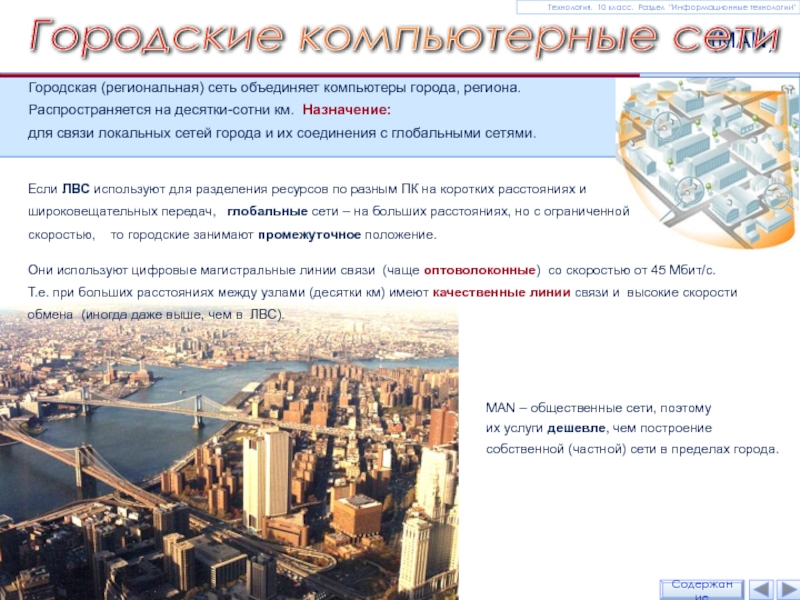 Городская (региональная) сеть объединяет компьютеры города, региона.