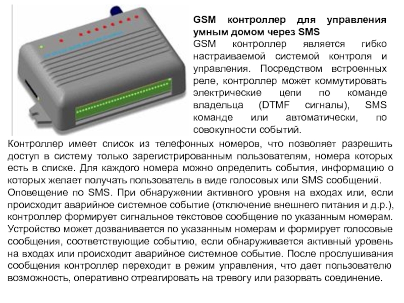 GSM контроллер является гибко настраиваемой системой контроля и управления. Посредством встроенных реле, контроллер может коммутировать электрические цепи по команде владельца (DTMF сигналы), SMS команде или автоматически, по совокупности событий.