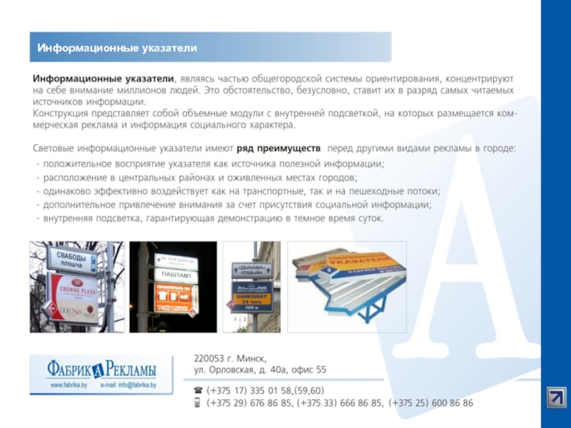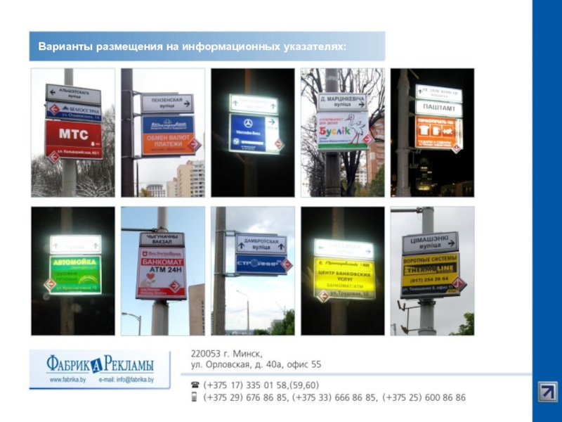 Информационные указатели Варианты размещения на информационных указателях: презентация