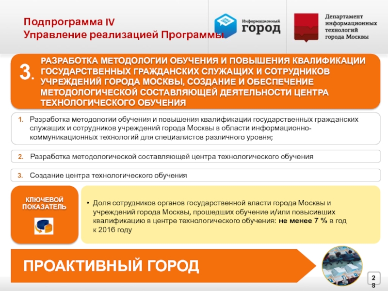 Доля сотрудников органов государственной власти города Москвы и учреждений города Москвы, прошедших обучение и/или повысивших квалификацию в центре технологического обучения: не менее 7 % в год к 2016 году