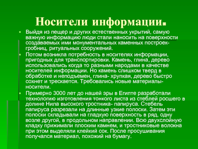 Потом возникла потребность в носителях информации, пригодных для транспортировки. Камень, глина, дерево использовались когда то разными народами в качестве носителей информации. Но камень слишком тверд в обработке и неподъемен, глина- хрупкая, дерево быстро сохнет и трескается. Требовались новые материалы- носители.