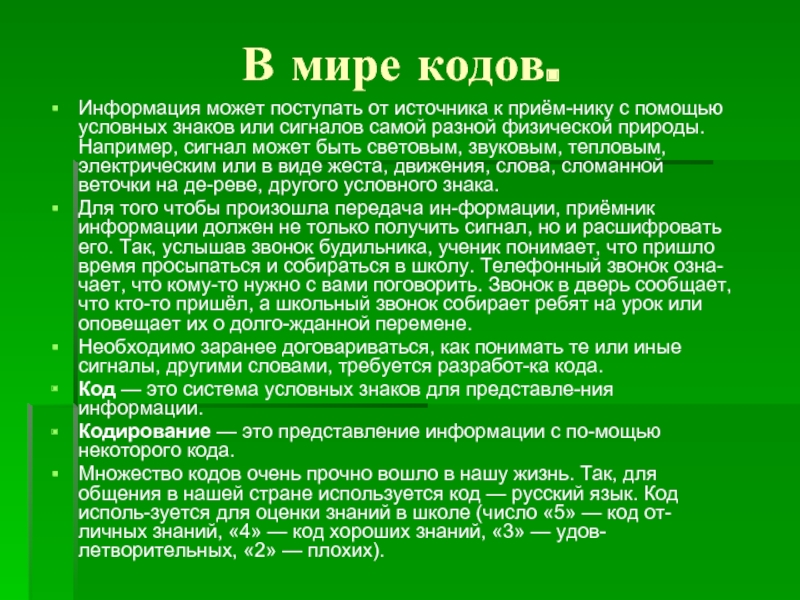 Множество кодов очень прочно вошло в нашу жизнь. Так, для общения в нашей стране используется код — русский язык. Код используется для оценки знаний в школе (число «5» — код отличных знаний, «4» — код хороших знаний, «3» — удовлетворительных, «2» — плохих).
