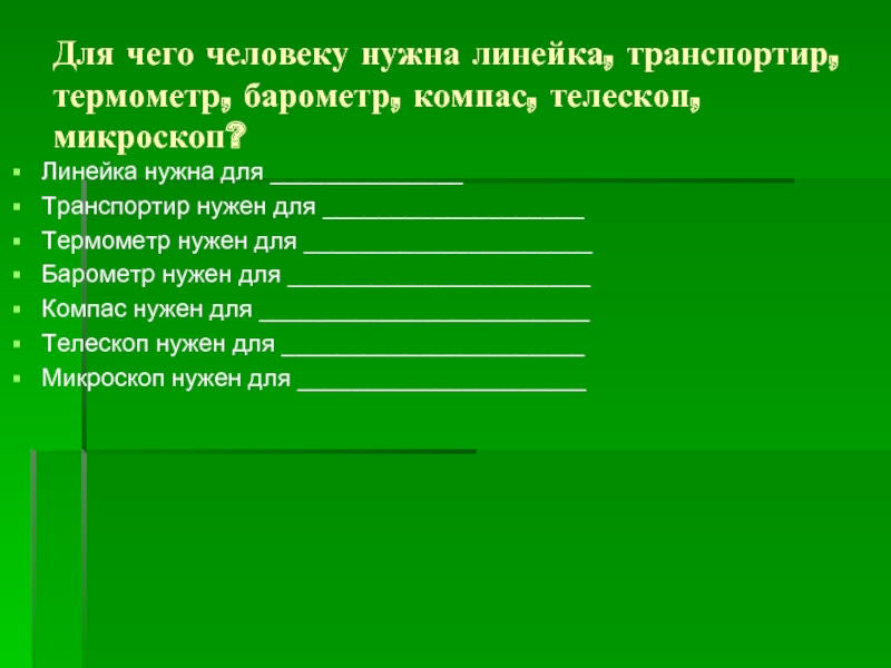 Слайд 11Для чего человеку нужна линейка, транспортир, термометр, барометр, компас, телескоп, микроскоп?