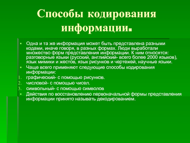 кодами, иначе говоря, в разных формах. Люди выработали множество форм представления информации. К ним относятся: разговорные языки (русский, английский- всего более 2000 языков), язык мимики и жестов, язык рисунков и чертежей, научные языки.
