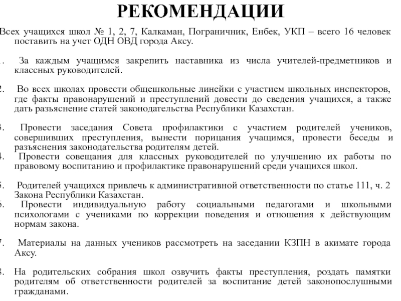2. 03.11.2011 года в 7.30 утра на территории СОШ № 7 ученик школы № 4 Иманкулов из-за неприязненных отношений избил ученика СОШ № 7 Серикова, который получил перелом переносицы и сотрясение мозга. Факт был доведен до отдела образования, однако подросток не владеет знаниями об ответственности за физическое насилие, т.е. здесь слабая работа школ по правовому воспитанию и профилактике правонарушений.