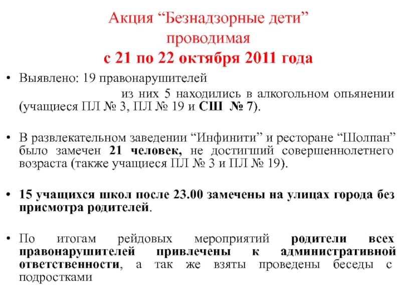 1. Так 08.10.2011 года с заявлением в ОВД обратилась родительница школы Гагарина о принятии мер к ученице 6 класса Жазыкбаевой А., которая побила ее дочь, затем схватила ее за волосы, после чего она, упав на пол, ударилась об пол, получила сотрясение мозга. О данном факте стало известно на заседании КЗПН 07.11.2011 года.