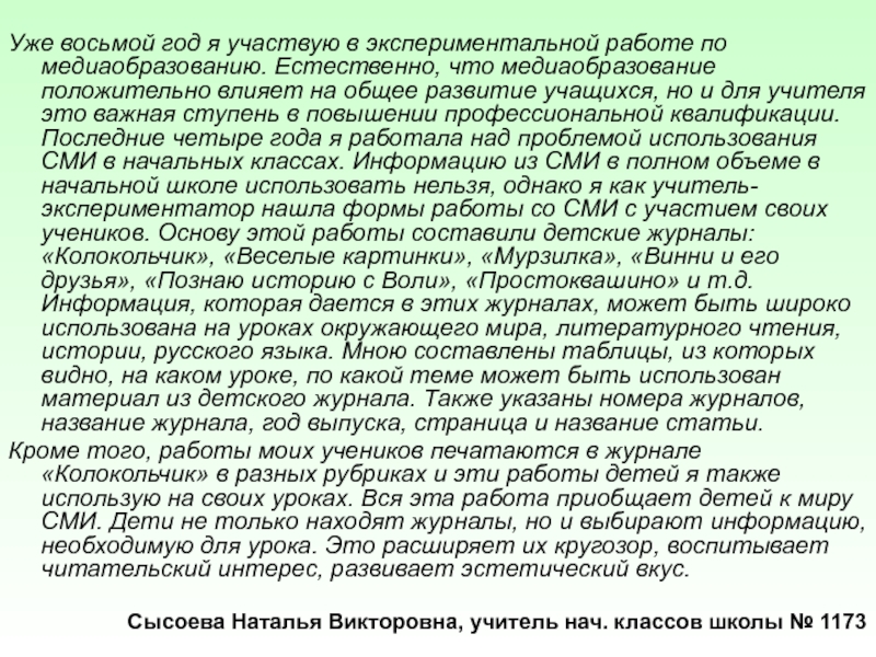 что медиаобразование положительно влияет на общее развитие учащихся, но и для учителя это важная ступень в повышении профессиональной квалификации. Последние четыре года я работала над проблемой использования СМИ в начальных классах. Информацию из СМИ в полном объеме в начальной школе использовать нельзя, однако я как учитель-экспериментатор нашла формы работы со СМИ с участием своих учеников. Основу этой работы составили детские журналы: «Колокольчик», «Веселые картинки», «Мурзилка», «Винни и его друзья», «Познаю историю с Воли», «Простоквашино» и т.д. Информация, которая дается в этих журналах, может быть широко использована на уроках окружающего мира, литературного чтения, истории, русского языка. Мною составлены таблицы, из которых видно, на каком уроке, по какой теме может быть использован материал из детского журнала. Также указаны номера журналов, название журнала, год выпуска, страница и название статьи.