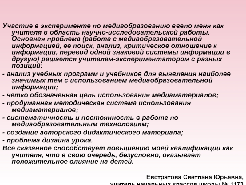Участие в эксперименте по медиаобразованию ввело меня как учителя в область
