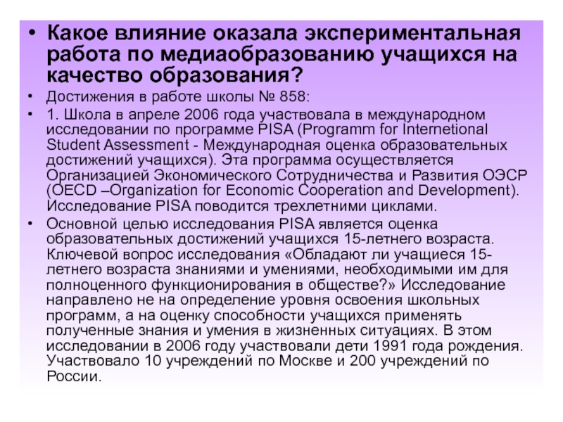 Основной целью исследования PISA является оценка образовательных достижений учащихся 15-летнего возраста. Ключевой вопрос исследования «Обладают ли учащиеся 15-летнего возраста знаниями и умениями, необходимыми им для полноценного функционирования в обществе?» Исследование направлено не на определение уровня освоения школьных программ, а на оценку способности учащихся применять полученные знания и умения в жизненных ситуациях. В этом исследовании в 2006 году участвовали дети 1991 года рождения. Участвовало 10 учреждений по Москве и 200 учреждений по России.
