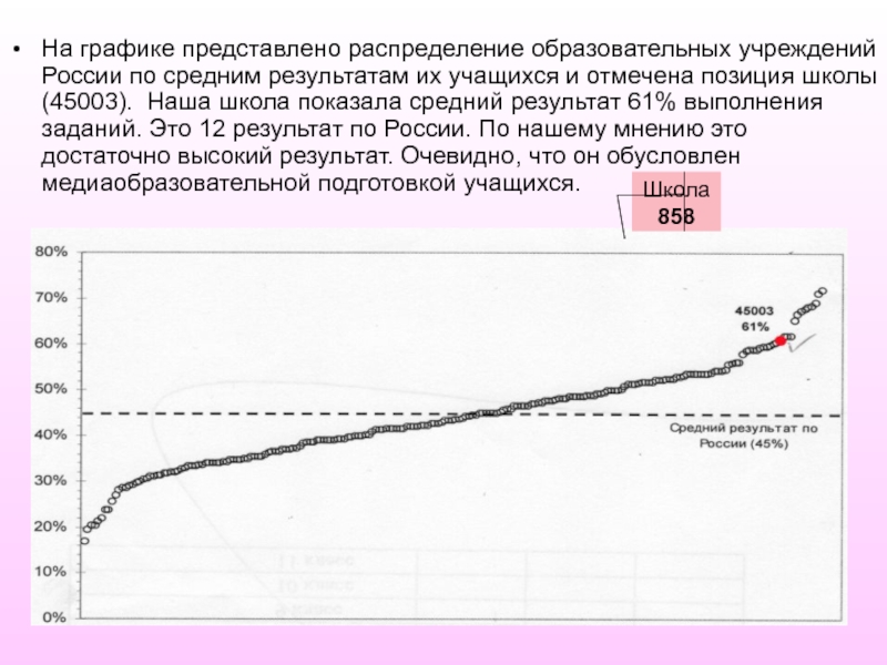 учащихся и отмечена позиция школы (45003). Наша школа показала средний результат 61% выполнения заданий. Это 12 результат по России. По нашему мнению это достаточно высокий результат. Очевидно, что он обусловлен медиаобразовательной подготовкой учащихся.