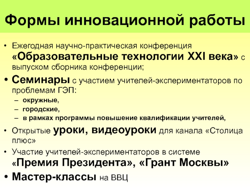 Участие учителей-экспериментаторов в системе «Премия Президента», «Грант Москвы»