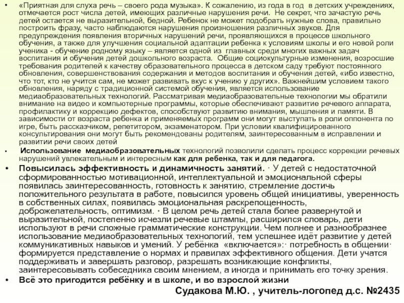 Судакова М.Ю. , учитель-логопед д.с. №2435