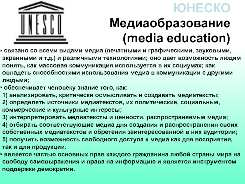 графическими, звуковыми, экранными и т.д.) и различными технологиями; оно дает возможность людям понять, как массовая коммуникация используется в их социумах; как овладеть способностями использования медиа в коммуникации с другими людьми;