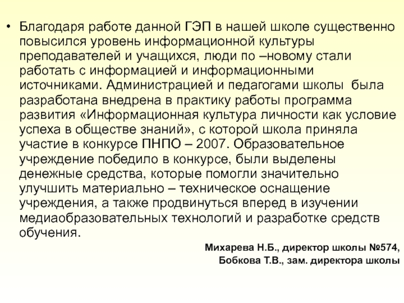 культуры преподавателей и учащихся, люди по –новому стали работать с информацией и информационными источниками. Администрацией и педагогами школы была разработана внедрена в практику работы программа развития «Информационная культура личности как условие успеха в обществе знаний», с которой школа приняла участие в конкурсе ПНПО – 2007. Образовательное учреждение победило в конкурсе, были выделены денежные средства, которые помогли значительно улучшить материально – техническое оснащение учреждения, а также продвинуться вперед в изучении медиаобразовательных технологий и разработке средств обучения.