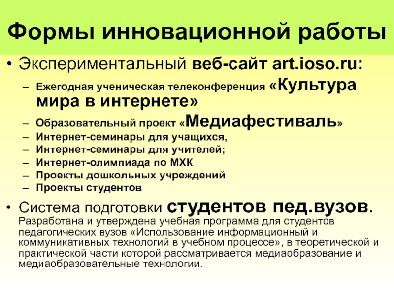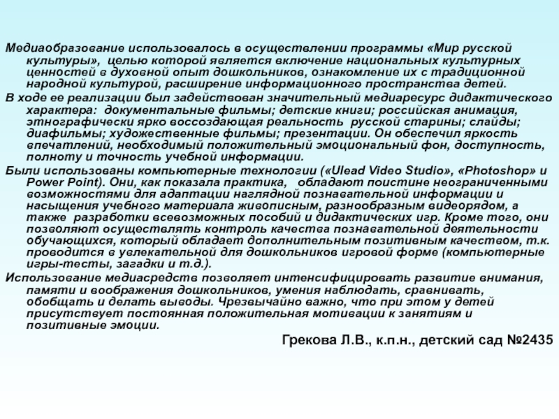 Медиаобразование использовалось в осуществлении программы «Мир русской культуры», целью которой является