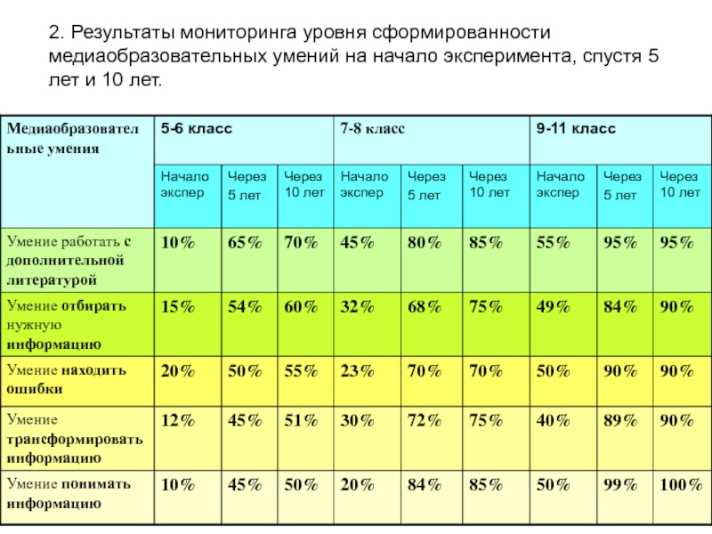 Слайд 272. Результаты мониторинга уровня сформированности медиаобразовательных умений на начало эксперимента, спустя