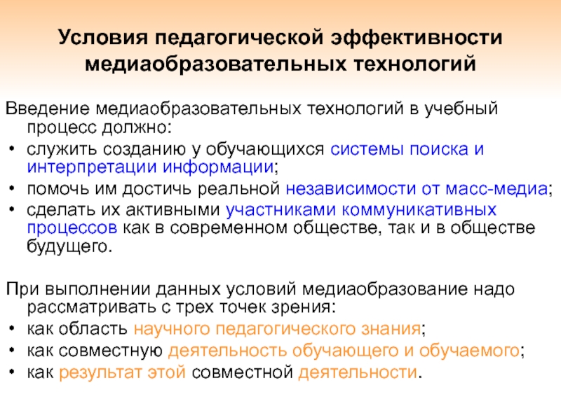 Слайд 7Условия педагогической эффективности медиаобразовательных технологий