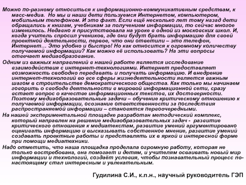 На нашей экспериментальной площадке разработан методический комплекс, который направлен на решение медиаобразовательных задач - развитие критического отношения к медиатекстам, развитие умений аргументировано оценивать информацию и высказывать собственное мнение, развитие умений создавать проектные работы и представлять их в яркой и интересной форме при помощи медиатехники.