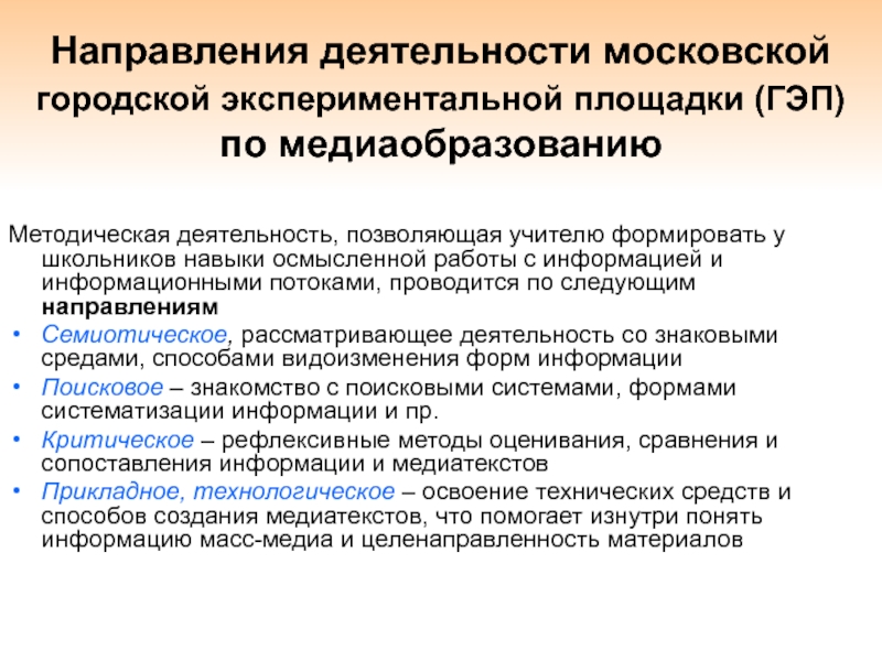 Слайд 4Направления деятельности московской городской экспериментальной площадки (ГЭП) по медиаобразованию
