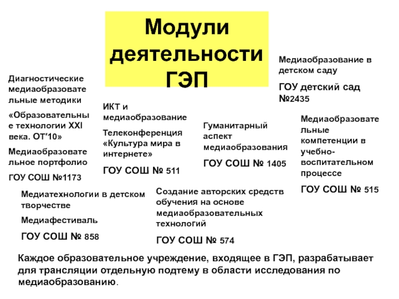 Каждое образовательное учреждение, входящее в ГЭП, разрабатывает для трансляции отдельную подтему в области исследования по медиаобразованию.