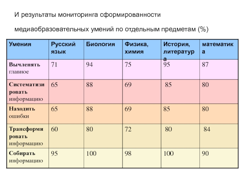Слайд 28И результаты мониторинга сформированности медиаобразовательных умений по отдельным предметам (%)