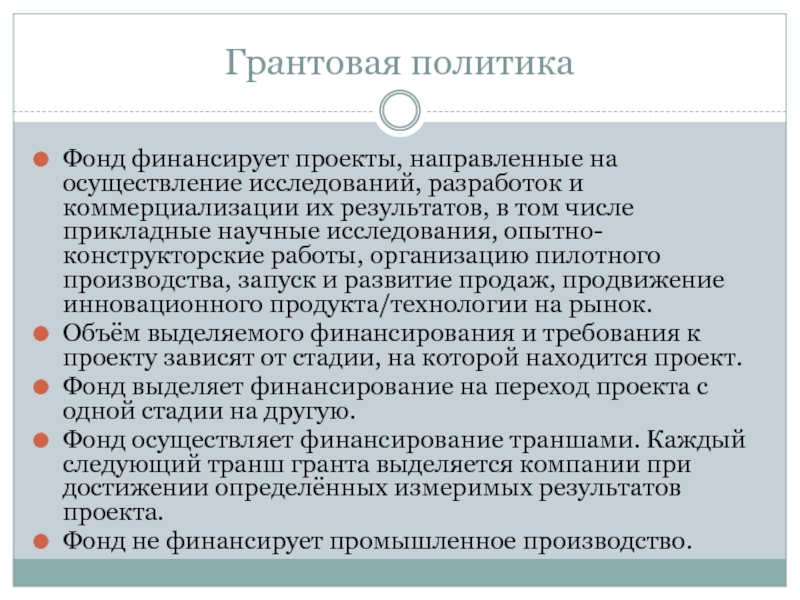Фонд выделяет финансирование на переход проекта с одной стадии на другую.