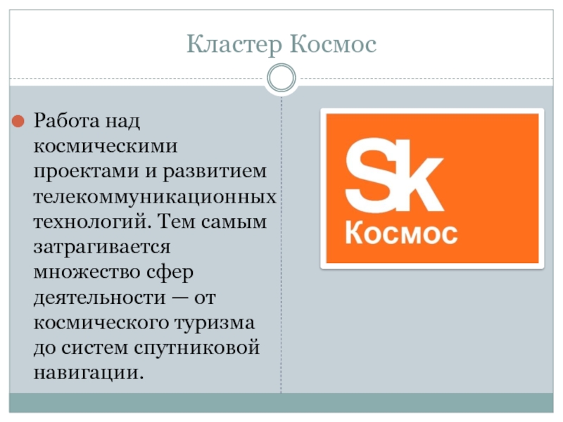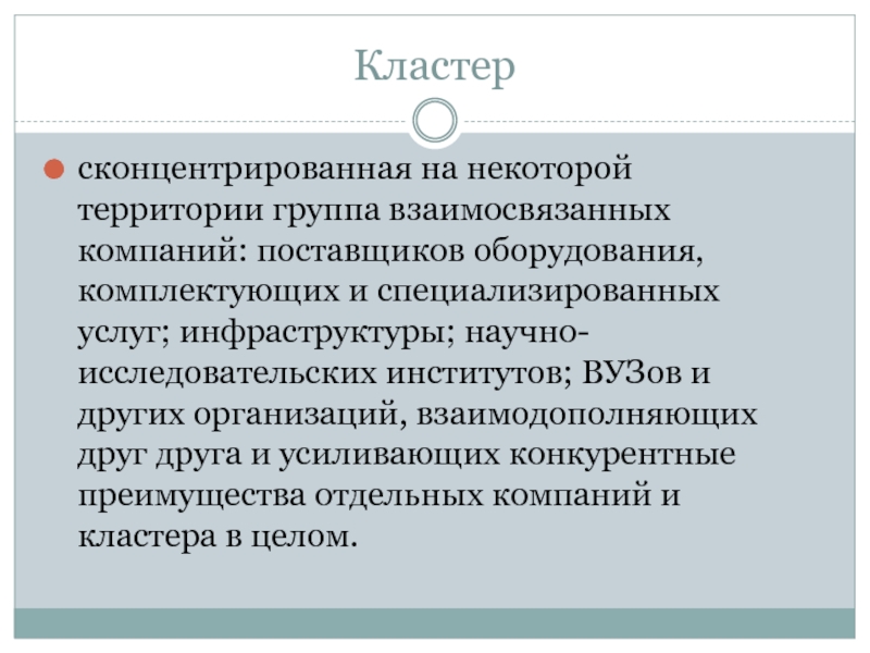 специализированных услуг; инфраструктуры; научно-исследовательских институтов; ВУЗов и других организаций, взаимодополняющих друг друга и усиливающих конкурентные преимущества отдельных компаний и кластера в целом.