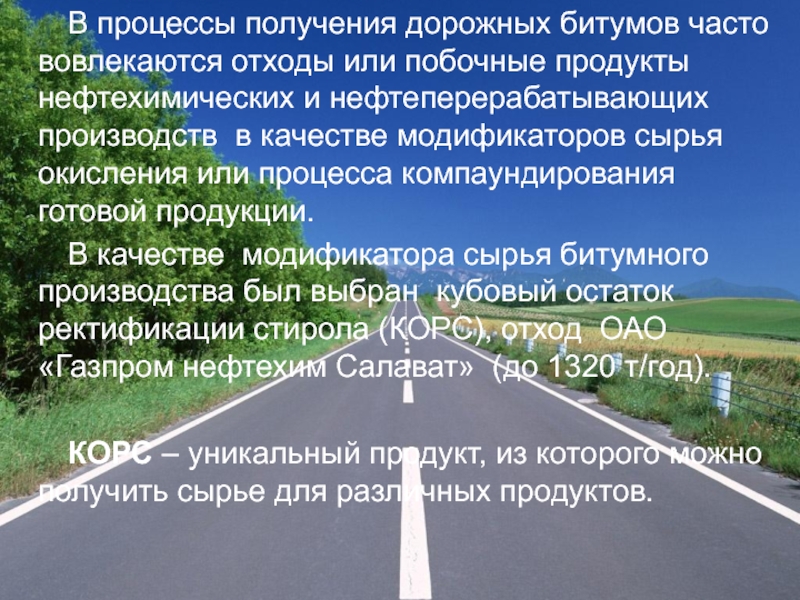 В настоящее время проблема повышения эксплуатационной надежности автомобильных дорог имеет особую актуальность. Мы наблюдаем возрастание интенсивности движения на дорогах. Это требует повышения качества и надежности асфальтобетонных покрытий. На помощь приходит модифицированный битум – как связующий компонент минерального материала дорожного покрытия.