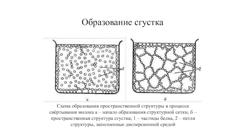 начало образования структурной сетки, б – пространственная структура сгустка; 1 – частицы белка, 2 – петли структуры, заполненные дисперсионной средой